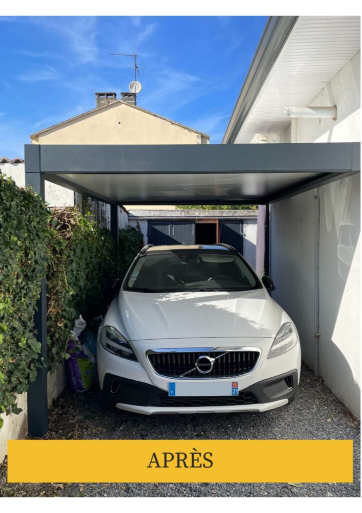 Soucieux des demandes de notre cliente, nous luis avons proposé de nous occuper de la débarrasser de la structure en métal et de la végétation envahissante, avant l’installation de son carport sur mesure.
